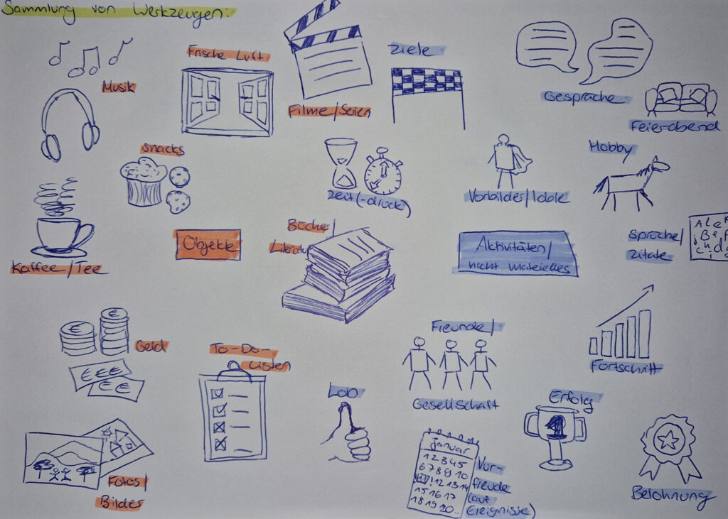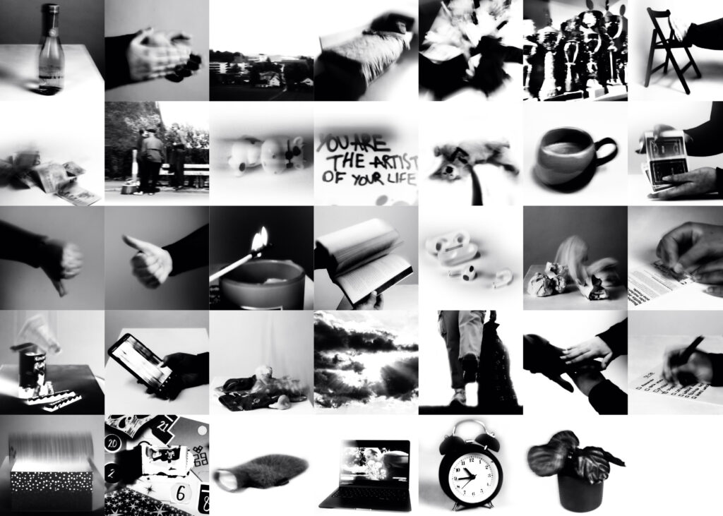 A broad range of objects was photographed to capture their motivational potential, both in direct and abstract ways. The images were converted into black and white to create consistency and stripped of their backgrounds, producing miniature-like versions that could be flexibly integrated into the layout. This approach gave the visuals a cohesive aesthetic while allowing the focus to remain on the symbolic meaning of each object.