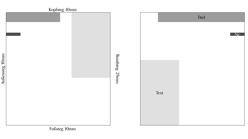 The page layout was defined with margins of 10 mm for top, outer, and bottom edges, and 25 mm for the inner margin. Titles always appear at the top outer corner, with the object number directly below. The accompanying text is placed along the inner margin, either at the top or bottom depending on the length of the title. Images follow on the next page, guided by an arrow placed next to the object number.