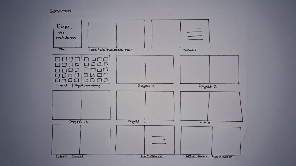 To establish the flow of the book, a storyboard was created on paper at an early stage. It mapped out the introduction, the sequence of objects, and the closing sections, providing a framework for how content and visuals would interact. This structured plan offered guidance throughout the design phase and ensured a coherent reading experience across all 50 entries.