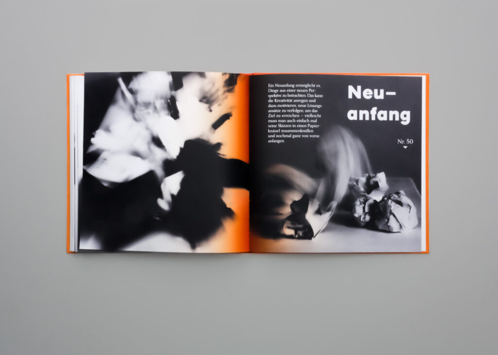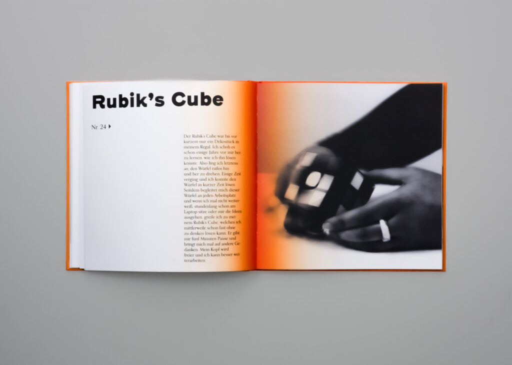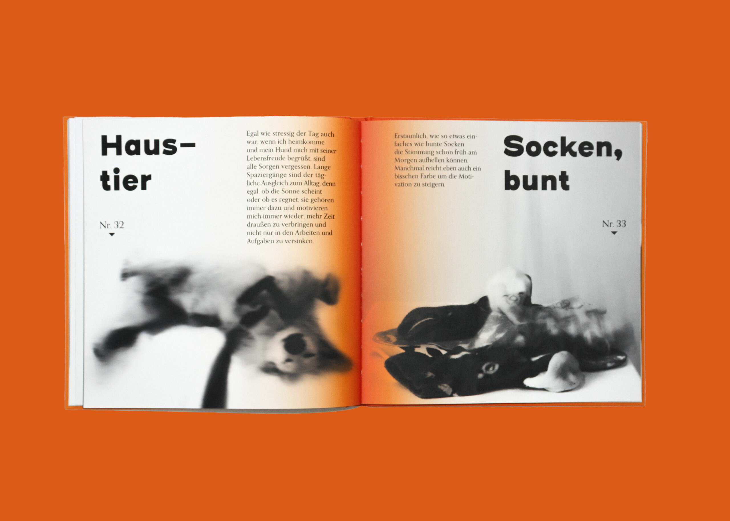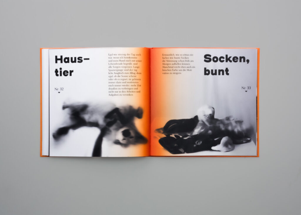 The project began with extensive research into motivational strategies and the development of a clear concept for a book that collects everyday objects as sources of drive. Initial experiments explored illustrations as the primary visual language, but this approach was later replaced by blurred photography, which conveyed movement and energy more effectively. Parallel to the visual exploration, texts were written to accompany the objects, supported by the selection of a color palette that reflected motivation and positivity. Once content and visuals were defined, the focus shifted to layout. A flexible grid system was established to structure the 50 entries, balancing text-only and text-image spreads. Finally, the book’s title and cover design were developed, complemented by a fold-out dust jacket that doubles as a poster, extending the project beyond the book itself.
