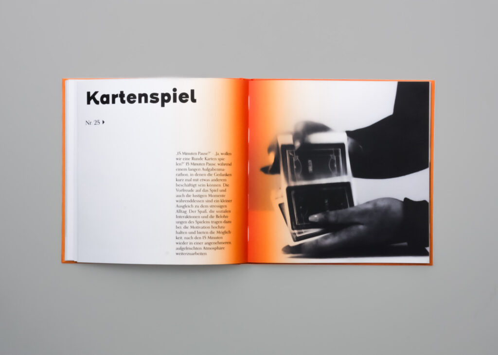 The layout follows a grid that structures the 50 objects and situations. The book opens with a table of contents and an introductory section, including a full-page image and five guiding questions. Each object is presented with a title and accompanying text; depending on the content, this can appear alongside an image or as text-only when visuals are not suitable. Placement is guided by a small arrow, indicating whether the corresponding photo is on the same page, on the facing page, or following on the next page. This system creates rhythm and variation while maintaining orientation.