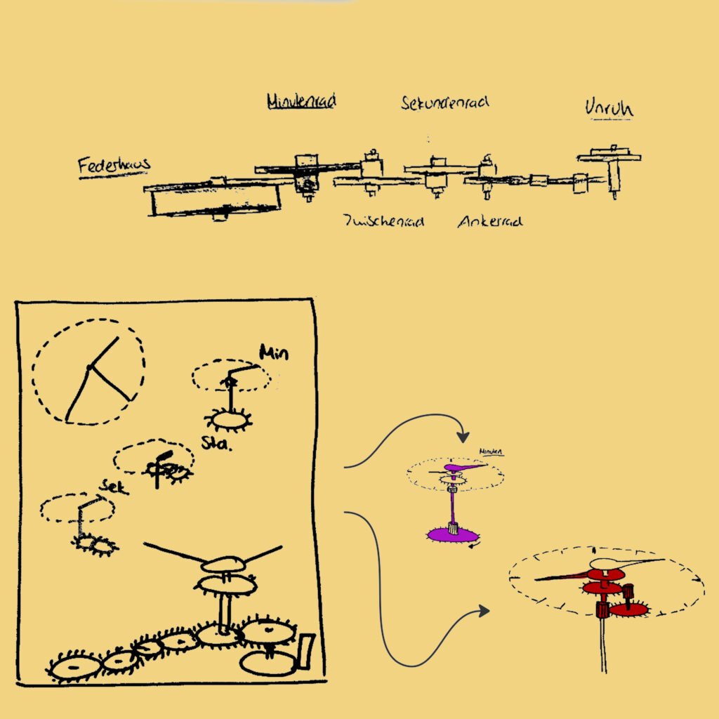 Initial scribbles served to break down the clock mechanism into simplified forms and visual concepts. They translated the complex structure of a clock mechanism into simplified sketches. These drawings were used to explore how individual components could be visually represented and how technical content might be made accessible. They laid the foundation for the poster design by clarifying proportions, relationships, and the potential flow of information.