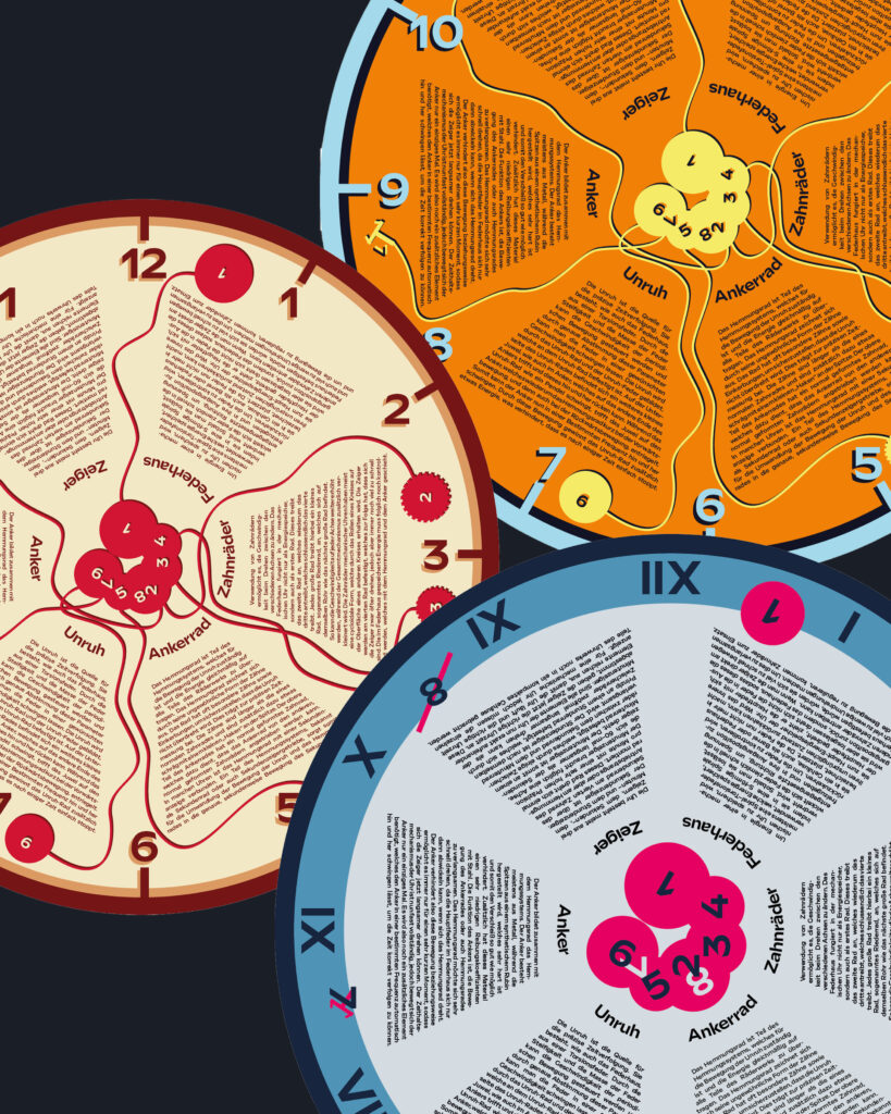Different design variants were developed to explore how the complex mechanism of a clock could be communicated visually. Each version experimented with layout, typography, and the use of color to test readability and focus. While some designs leaned towards a reduced style, others placed more emphasis on visual connections and highlighted elements. These iterations made it possible to compare levels of abstraction and find a balance between technical precision and accessibility, ultimately leading to a clear and engaging final design.