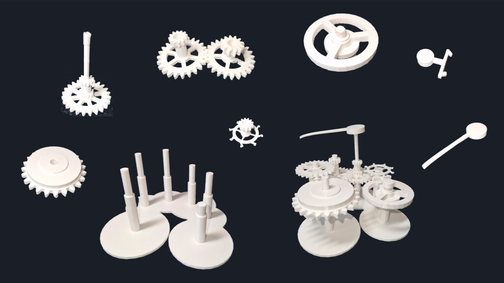 The 3D-printed models brought the abstract clock mechanism into a tangible form. At first, the printing process presented several challenges, as the delicate parts did not come out with the desired precision. After a number of adjustments and repeated attempts, the models were successfully produced.