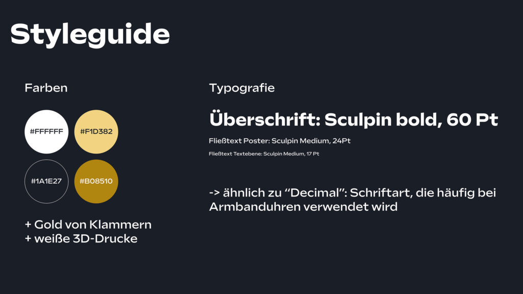 A styleguide ensured visual consistency across all elements of the project. The color palette combined white, gold, yellow, and dark blue, while the typeface “Sculpin” was chosen for its formal clarity and its resemblance to the “Decimal” typeface often used in watch design. Hierarchies were established through bold headings and medium weights for body text.