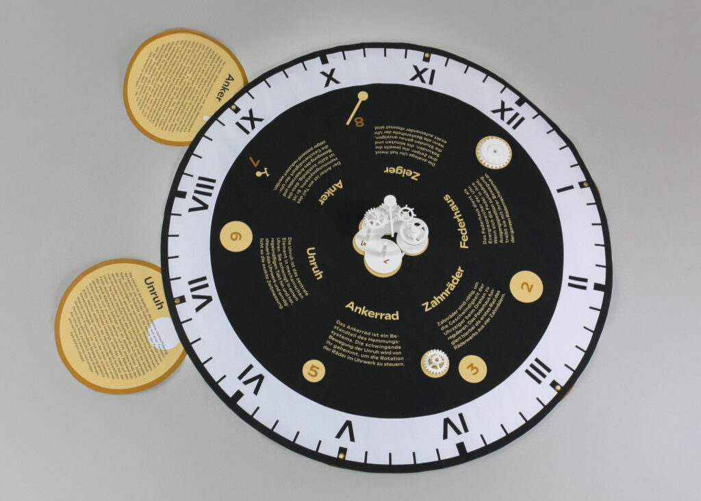 For the exhibition, the poster and 3D-printed elements were combined: The poster was designed with two levels of information. On the first layer, viewers could quickly grasp the basics of each clock component, while additional panels could be pulled out from beneath the main poster to reveal more detailed informations. The 3D-printed parts were placed alongside the corresponding texts and numbered for clarity. By following these numbers, visitors were able to assemble the mechanism themselves and experience how the individual elements interact with each other.