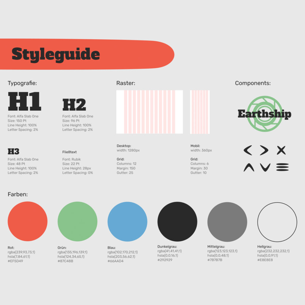 The style guide ensures consistency across the website. Headers use “Alpha Slab One”, paired with “Rubik” for body text, while the layout follows a 12-column grid for desktop and a 6-column grid for mobile. The color palette includes red, green, and blue as accent colors, complemented by three shades of gray. This styleguide establishes a cohesive visual language, aligning typography, color, and layout throughout the website.
