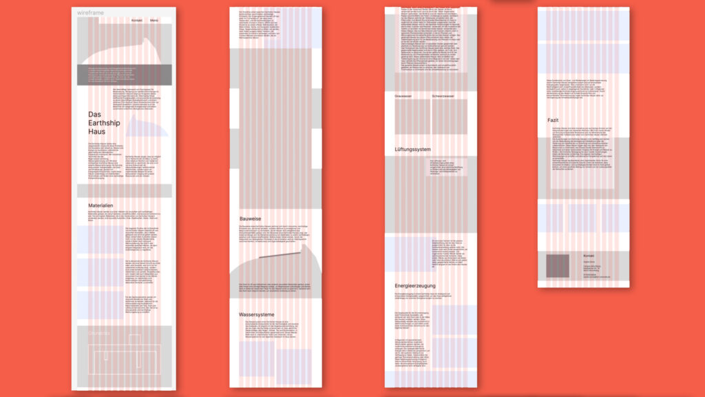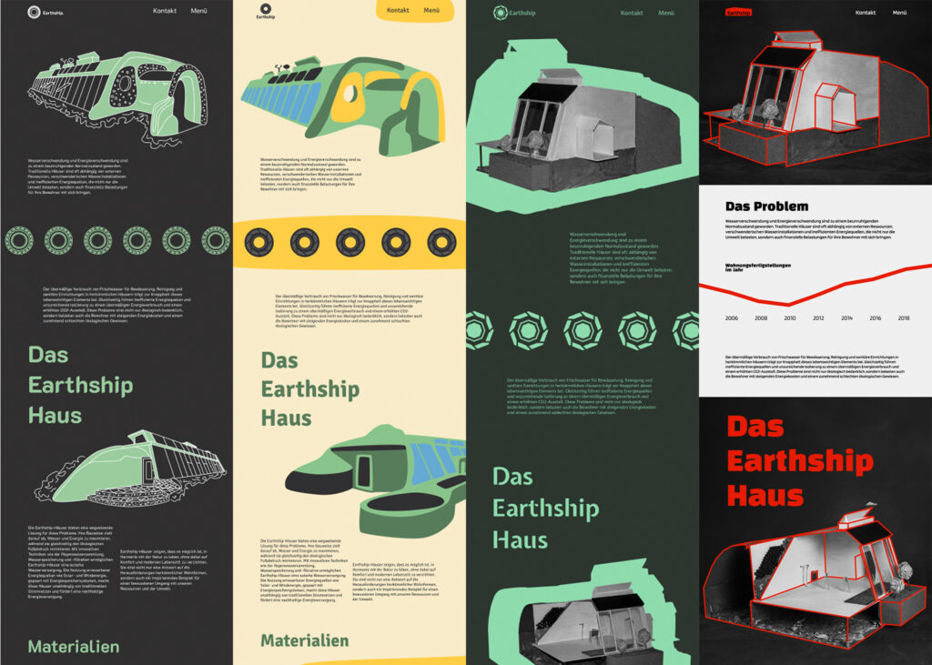 The process began with research into the ecological and architectural principles of Earthship houses. Based on this, different concepts for structuring the website were developed, either categorically or through a narrative arc that moves from problem to solution. Design explorations initially focused on variant two, which combined illustrations with photographs, before refining the color palette to red, green, and blue alongside shades of grey for emphasis and clarity. Alongside the digital design, a physical Earthship model was built and documented through photography, creating a link between concept and visualization. The final website integrates text, illustrations, and model photography into a coherent system, making the complexity of Earthship architecture accessible to a broad audience.