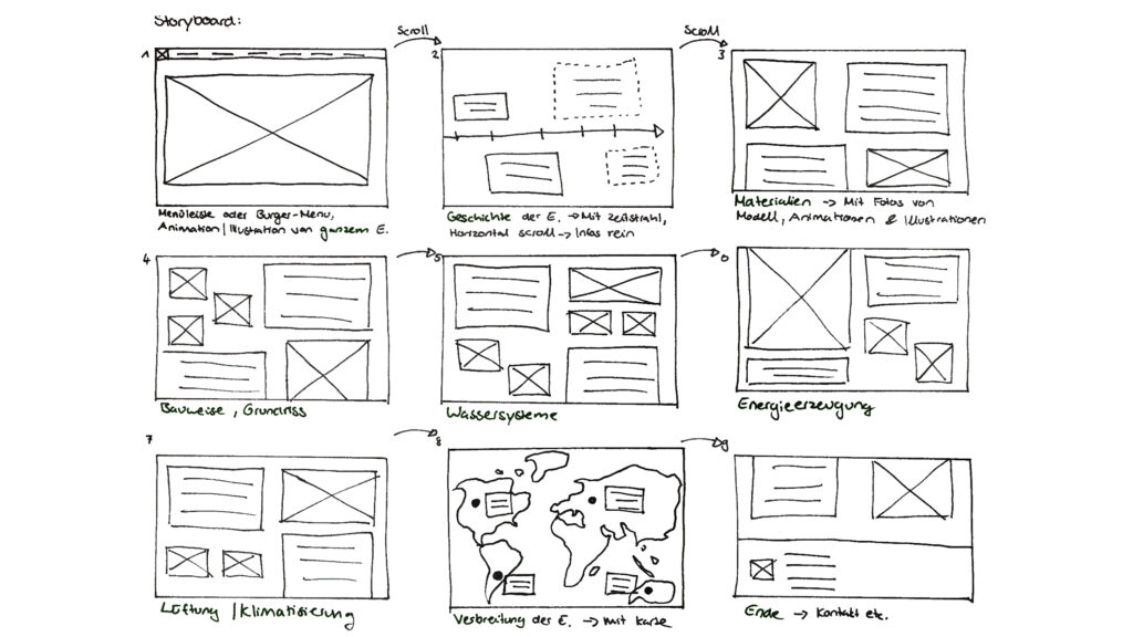 The process started with a hand-drawn storyboard. These sketches visualized the overall structure and flow of the content, helping to plan how users would navigate through the site. By mapping out the logical sequence of categories and content, the storyboard ensured that each topic followed a coherent narrative. It also allowed helped to explore the relationship between different sections, testing how to introduce problems and solutions effectively.