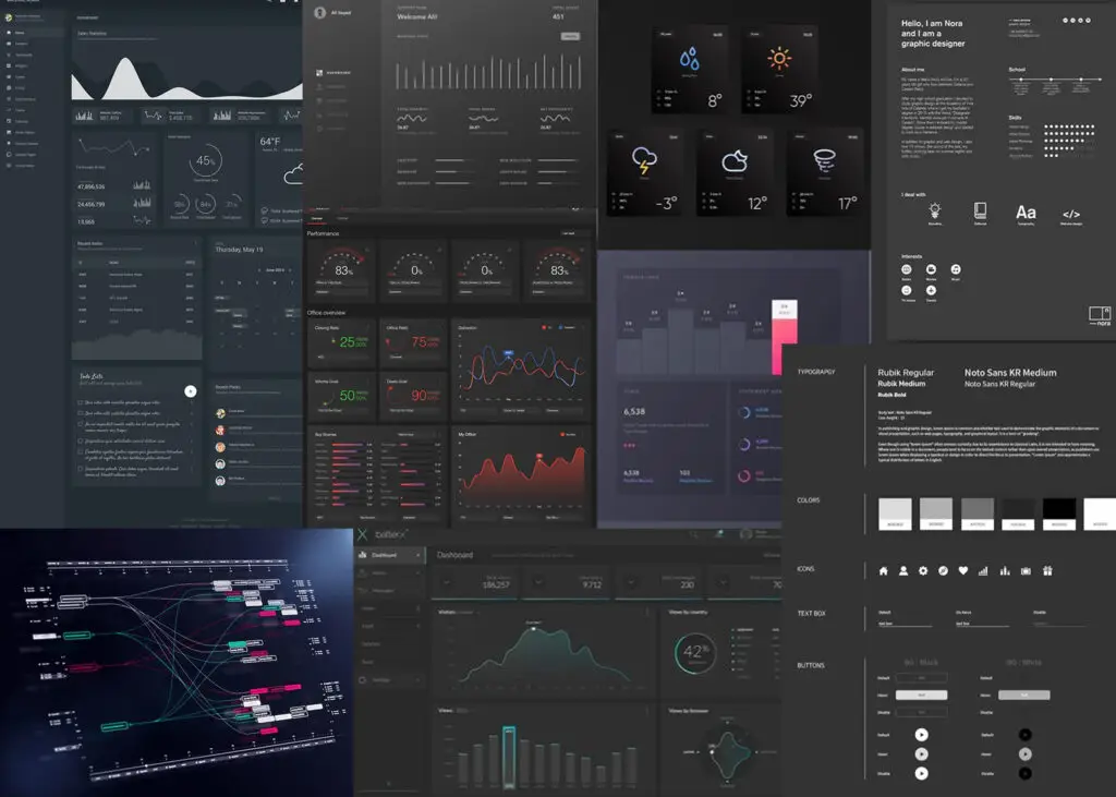 The moodboard conveys a professional, data-driven, and clear aesthetic. It features a dark UI with black and dark gray tones, accented selectively with signal colors to highlight critical information. Clean lines, sharp contours, and structured data visualizations reinforce a technical and precise feel.