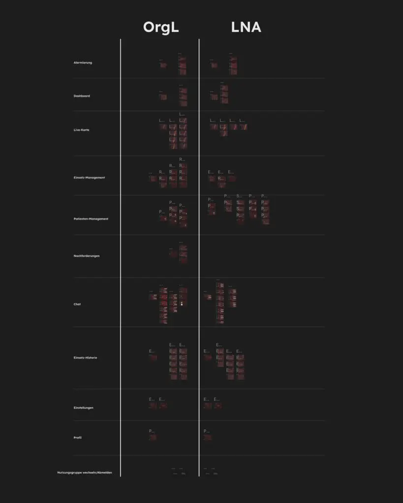 The development of RESCUE followed a structured, user-centered design process divided into four phases: research, definition, design, and prototyping. The project began with desk research to understand existing practices and limitations in mass-casualty response. This was followed by an expert interview with the ILS Bayreuth/Kulmbach, which provided valuable insights into real-world workflows and helped define the primary user groups. Based on this input, a detailed user journey was created, covering the phases before, during, and after an operation. Initial wireframes were then developed to visualize potential solutions and interaction patterns. These were tested in an usability testing with an OrgL and an LNA from BRK Kulmbach, leading to refinements in navigation, structure, and information flow. The final stage focused on the design and prototyping, realized through a component-based system to ensure consistency and scalability.