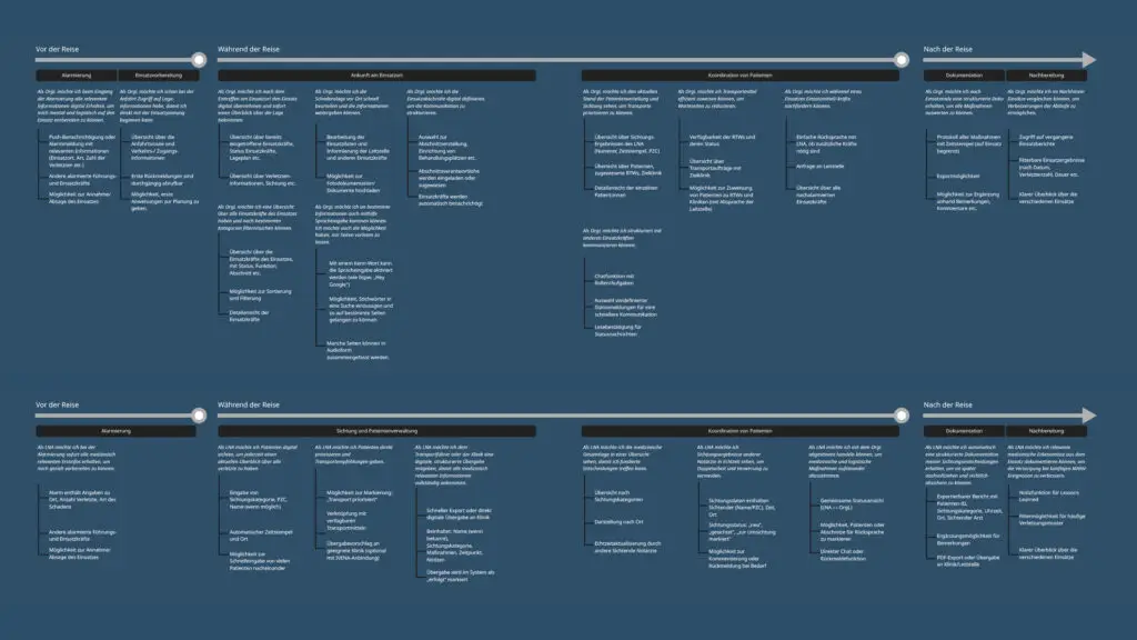 The user stories were developed for the two primary user groups, based on real workflows and challenges during emergency operations. They are structured along the timeline of an incident: before the operation, during the operation, and after the operation. In addition, overarching stories address scenarios relevant to both roles.