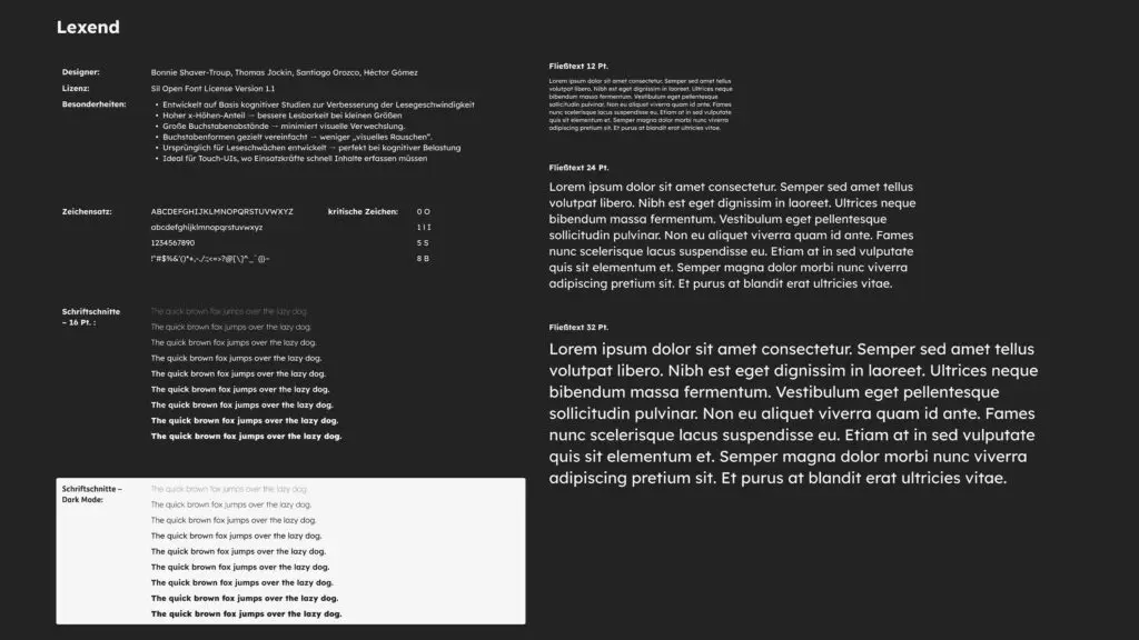 For the interface, the typeface Lexend was chosen, originally developed to support people with reading difficulties. Based on cognitive studies, it improves reading speed through wide letter spacing and simplified shapes, reducing visual noise and confusion. This makes it particularly effective under cognitive stress and in high-pressure environments.